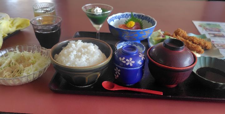 メインのトンカツもあるフライ。それに刺身、茶わん蒸し、デザートが付いています。これで1250円です(2025年11月)。多分同じだと思いますが夜メニューには1500円の値段が付いていました。この料理に1500円の値段が付いていたら高いな~とは思いますが、ま~しょうがないかとは思うという感じの料理でした。