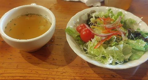 先にサラダとスープが到着し、程なくして調理も到着
